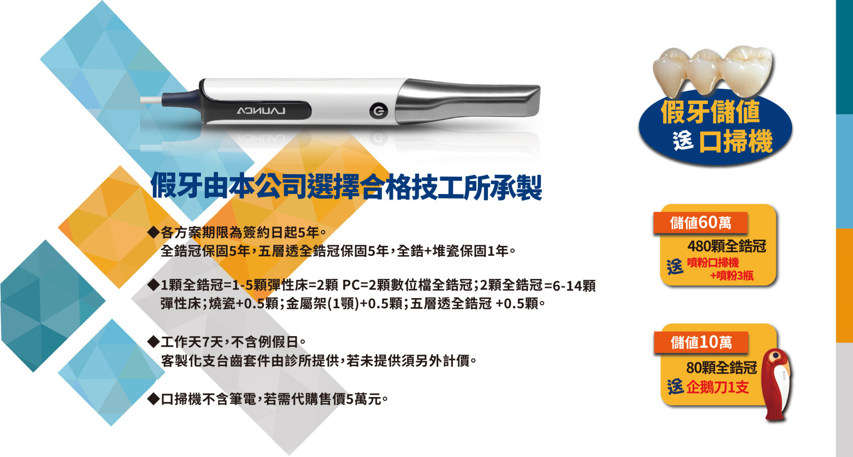 引進高新技術、引進平價優質的牙材打開知名度及市佔率、技轉高新技術量產並取得品管認證、牙科診所開業一條龍服務